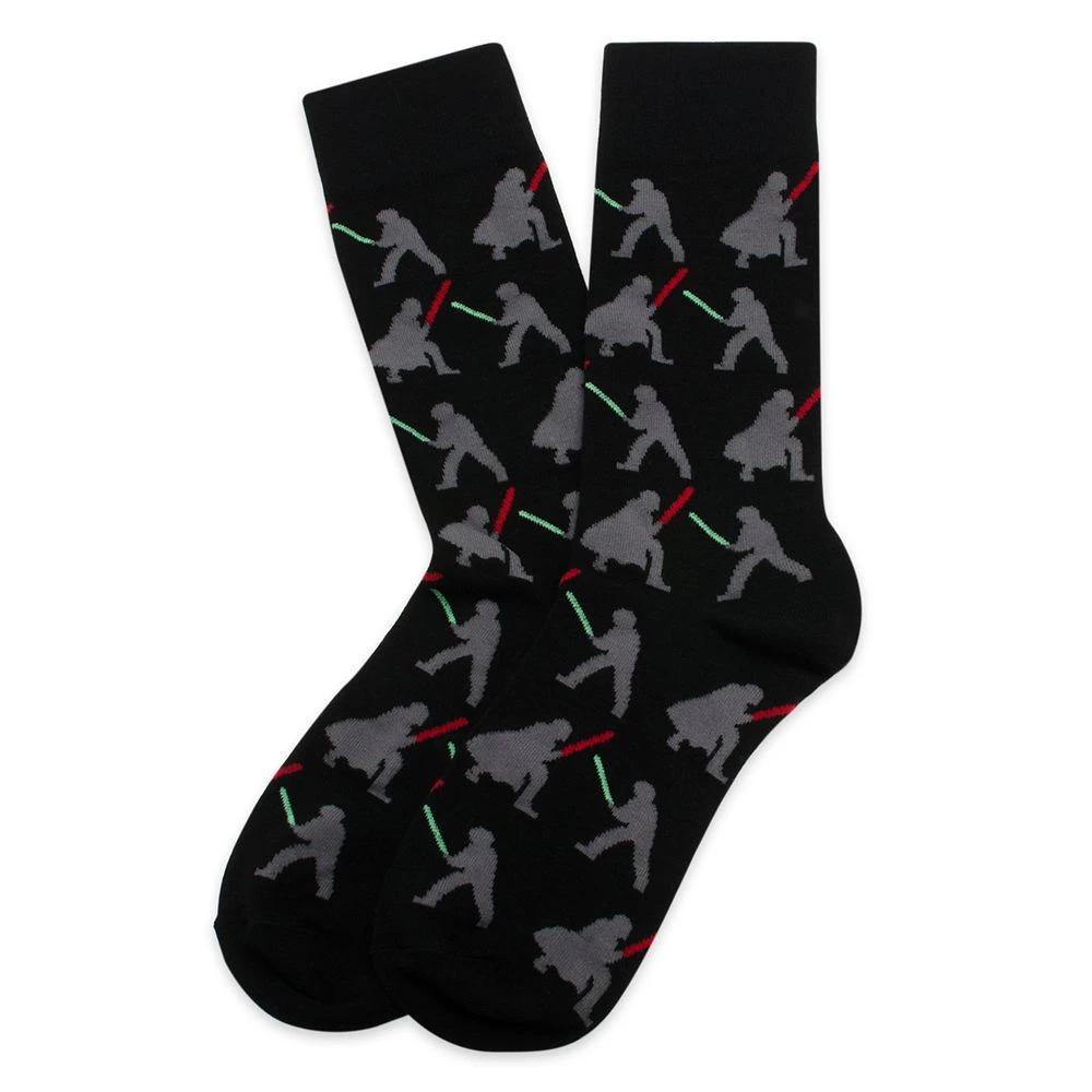 Take a walk on the dark side in these Star Wars socks featuring the epic Lightsaber duel between Darth Vader and Luke Skywalker. The red and green glow from their weapons stands out against the black background with the figures silhouetted in gray.