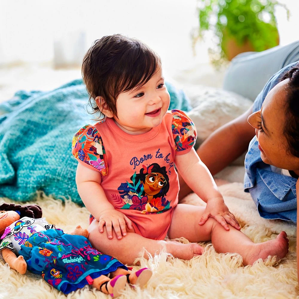 Like Mirabel, baby will feel ”born to be me” in this vibrant color bodysuit with floral print puffed sleeves and back featuring the endearing Encanto heroine on all sides, plus embroidered text.