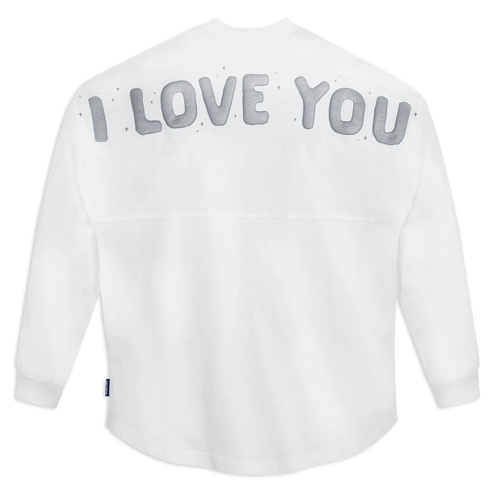 Cartoon likenesses of Princess Leia and Han Solo spark this Star Wars Spirit Jersey with a passionate flair. On the back, Leia’s famous confession, ”I Iove you,” is presented in puffy lettering with starfield decoration. Han’s witty response, ”I know,” can be found on a companion Spirit Jersey, sold separately.