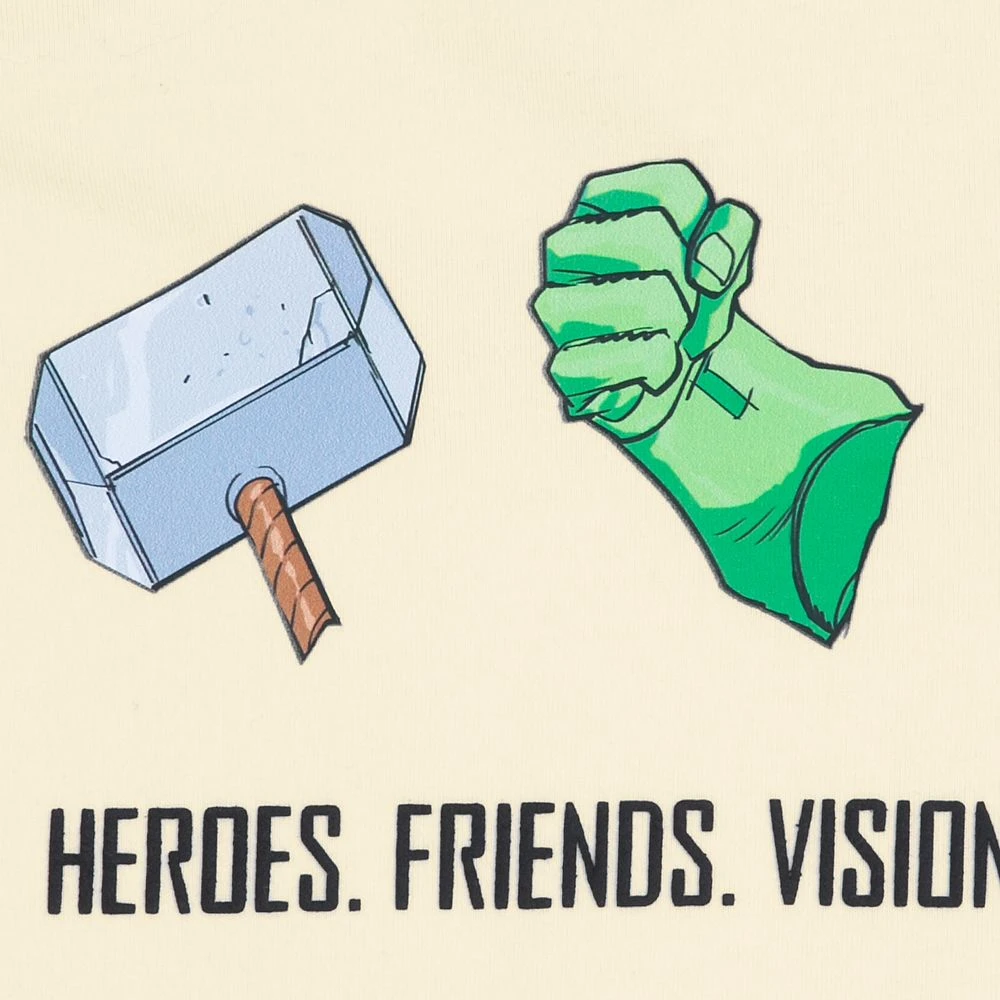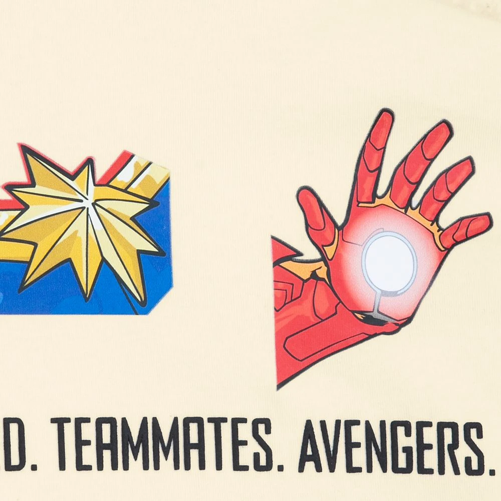 - Includes puff ink ”Heroes. Friends. Visionaries. Legends. Reassembled. Teammates. Avengers.” text