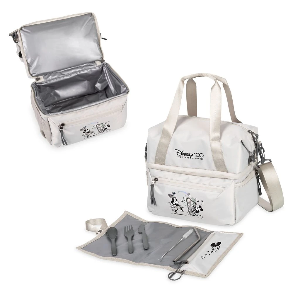 Enjoy lunch with best pals every day and be a good friend to the Earth with this Mickey and Minnie Mouse lunch bag. Made from recycled water bottles, this stylish insulated tote comes with a water resistant placemat, reusable metal straw and a set of utensils made from recycled plant fibers. Part of the Disney100 Celebration Collections, it features adorable screen art of Mickey and Minnie as well as the ”Disney100” logo and ”100 Years of Wonder” screen text. With plenty of compartments to keep everything organized and an adjustable shoulder strap, it’s sure to be your favorite go-to lunch companion.